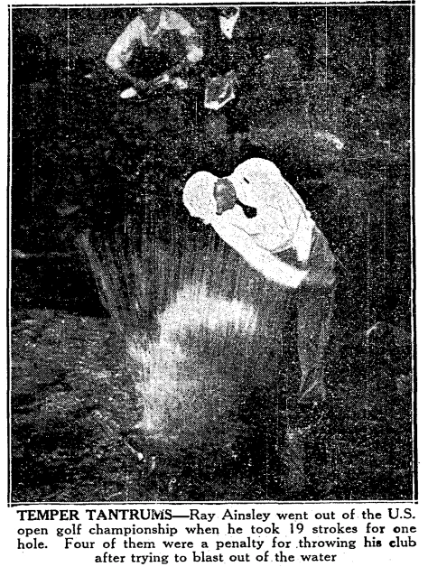 The Wikipedia page for the 1938 U.S. Open provides more details: apparently, Mr. Ainsley hit the ball into the water on the 16th hole. Instead of taking a penalty and taking his next shot on dry land, he repeatedly tried to hit the ball out of the water. His score of 19 remains the U.S. Open record.