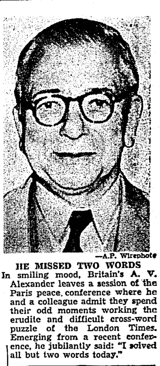 When not solving crosswords, Albert Victor Alexander, 1st Earl Alexander of Hillsborough (1885-1965) was serving as the First Lord of the Admiralty, a post he held three times: June 1929- August 1931, May 1940-May 1945, and August 1945-October 1946. Later in 1946, he was appointed Minister of Defense, a post that he held until 1950.