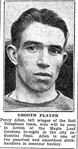 Percy Allen (1909-1989) was also sometimes referred to as Pearcy Allen; I'm not sure which name is correct. He was playing for a Toronto post office team in 1938 when he took a leave of absence from his job and was loaned to the Sudbury Wolves to help them win the world championship that year. He retired from hockey in 1940 and was a minor league referee for a number of years.
