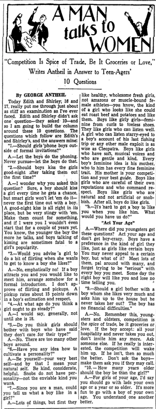 George Antheil (1900-1959) led a varied life. Besides being an advice columnist, he was an avant-garde composer, a mystery writer, and the co-inventor (with actor Hedy Lamarr) of a frequency-hopping method of ensuring that signals to radio-guided torpedoes are not jammed. (The Scientific American article on this is here.)
