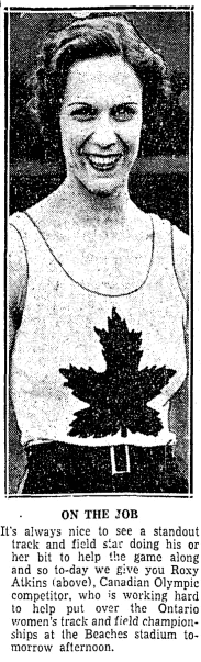 Roxy Atkins (1912-2002) was a competitor in the 1936 Olympic Games; she was a hurdler. After the Second World War, she married and moved to the United States, eventually becoming an American citizen. She worked with American track and field teams in 1956, 1971, and 1983, among others.
