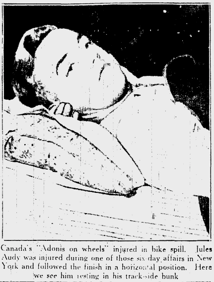 Jules Audy, nicknamed the "Blond Flash", was born in either 1911 or 1912, depending on what source you believe. He was a professional six-day bicycle racer; his career lasted from 1931 to 1950, with time out to serve in World War II.