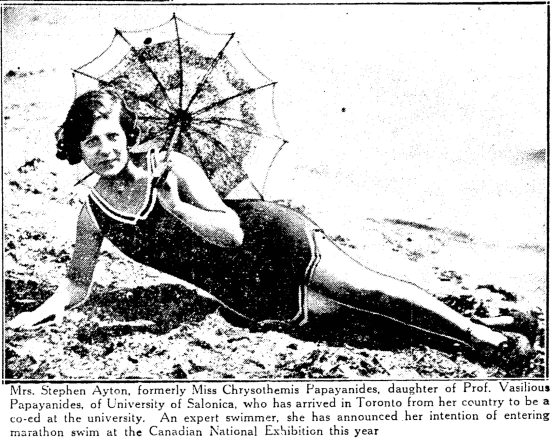 A search for Miss Chrystothemis Papaynides turned up absolutely nothing. But this is because a search for Mrs. Stephen Ayton revealed that her surname was actually Papagiannides. She seems to have normally been known as Chryssa.