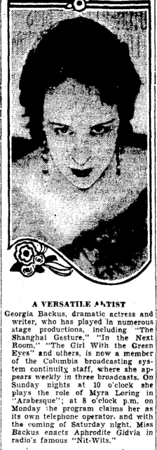 Georgia Backus (1901-1983) was a triple threat: she acted in, wrote, and directed radio plays. Later in 1930, she was named dramatic director for the Columbia Broadcasting System radio network. She was also part of Orson Welles' repertory company. Her career ended in the 1950s, when she was blacklisted.
