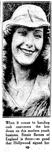 Binnie Barnes (1903-1998) was 29 at the time of this photograph, so I guess she still qualified as a modern youth. Born in London and one of 16 children, she appeared in a short film in 1923 and worked as a chorus girl, nurse, and dance hostess before starting her British film career in 1931. Her filmography indicates that she moved to Hollywood late in 1934.