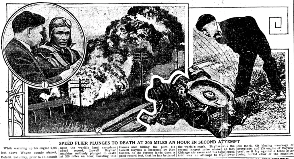Lowell Bayles (1900-1931) had just finished winning a number of events at the 1931 National Air Races when he decided to go for the landplane speed record. Analysis of the crash that killed him indicated that the aircraft's fuel cap came loose and struck Bayles in the head, causing him to lose control of the plane. YouTube has footage of the crash, which is horrifying to watch.