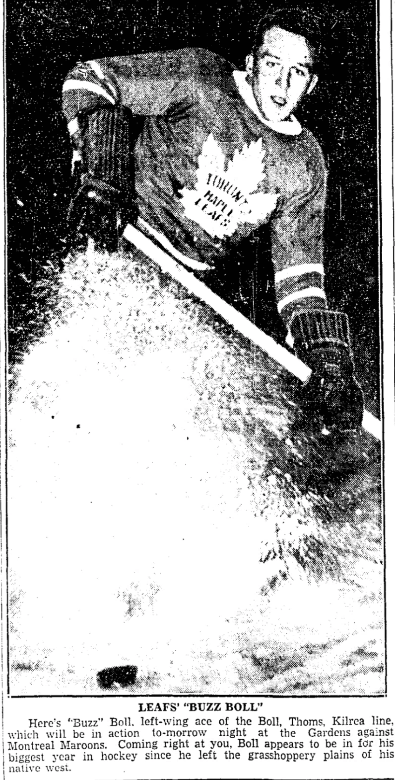 If Frank "Buzz" Boll (1911-1990) looks young in this picture, it's because he was young: he was 23 and in his second year as a Maple Leaf. He went on to a long career in the NHL, playing with the Leafs until 1939 and in the league until 1944.