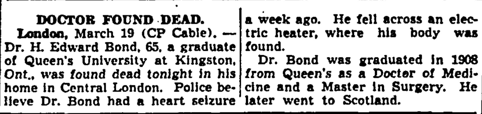 This is unbearably sad: if I read this correctly, Dr. Bond was dead for a week before anyone noticed he was missing.