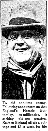 If Bigland had actually offered a cottage and a pound a week for life to his former enemy, he wouldn't have needed to provide them for long: Bottomley passed away a little over a month after this photo appeared. His obituaries stated that he was a man of considerable natural ability ruined by greed and vanity.