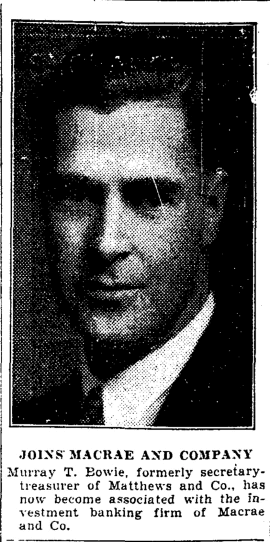 Mr. Bowie never moved or changed jobs again. The 1950 directory listed him once again as T. Murray Bowie, still at Macrae & Co., and still living at 30 Eastbourne. The 1951 directory lists his widow, Mary, at that home address.