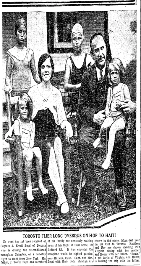 J. Erroll Boyd (1891-1960) was obviously not missing for long, as he lived for over 27 more years after this flight. In 1930, he had been the first Canadian to fly from Canada to England, earning him the nickname "The Lindbergh of England". (Charles Lindbergh was the first pilot to fly from New York City to Paris non-stop, achieving this feat in 1927.)