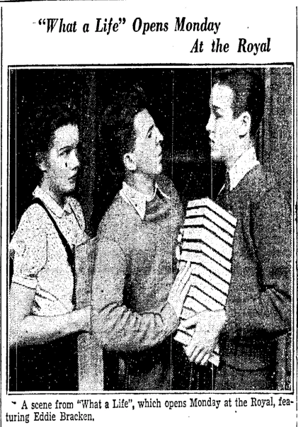 Given that the Broadway production of What a Life ran for 538 performances before closing in July 1939, and that Bracken had a bit part in Pacific Liner, a movie that began production in October 1938, I'm not sure how he found time to appear in Toronto. But his Wikipedia page states that he met his wife of 63 years, Connie Nickerson, in a road company production of What a Life in 1938; he might well have met her at about the time that this photograph was taken. The woman at the left of the photo might be her, but it's hard to tell.