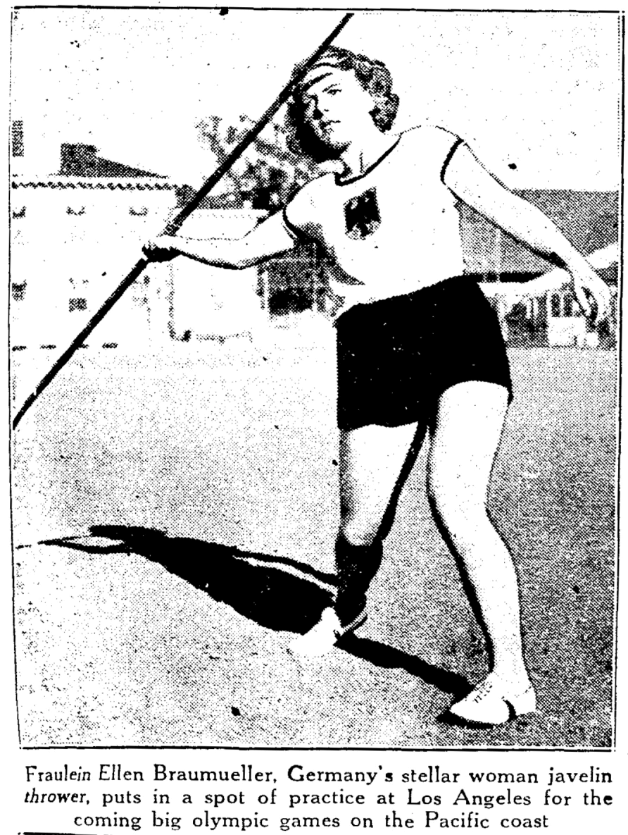 Ellen Braumüller (1910-1991) competed in the javelin, relay, discus, and high jump at the 1932 Los Angeles Olympics. The javelin practice paid off, as she won a silver medal in that event. Her German Wikipedia page states that she competed in the German championships in 1933, and won the discus event there.