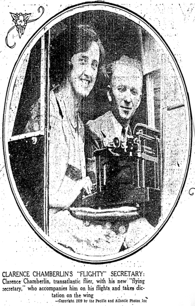 Clarence Chamberlin (1893-1976) was the second pilot to fly across the Atlantic Ocean (Charles Lindbergh was the first) and the first to fly with a passenger, which he accomplished in 1927. By the time of this photograph, Chamberlin was manufacturing and selling eight-seater airplanes; presumably, he and his secretary are being photographed in one of them.