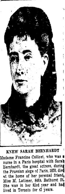 I couldn't find Madame Collinet in the 1928 Toronto city directory. But, since she had lived in Toronto for 42 years, I looked her up in the 1889 directory and found her there: