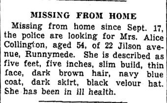 A search through the Runnymede section of the Toronto city directories revealed that her name was actually Alice Collinson, and her address was actually 22 Jillson Avenue. She appears in the 1927 and the 1928 city directories, which I hope means that somebody found her.