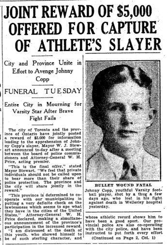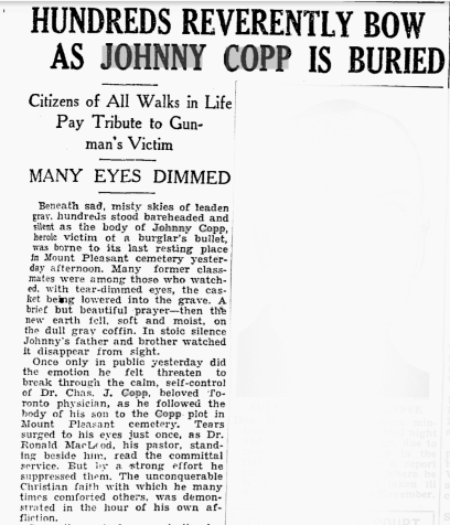 Despite the reward, the murderer of Johnny Copp was never found. He is buried in Mount Pleasant Cemetery; Mike Filey, a long-time writer of Toronto history, wrote up his story on the cemetery's web site. Mr. Copp was a rugby star and medical student at the University of Toronto and the university still awards a trophy and a scholarship in his name.