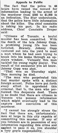 The caption stated that young Mr. Copp had a fighting chance of recovery, but unfortunately he did not survive. Three days later, the Daily Star reported that a $5000 reward had been offered for information on his killer: