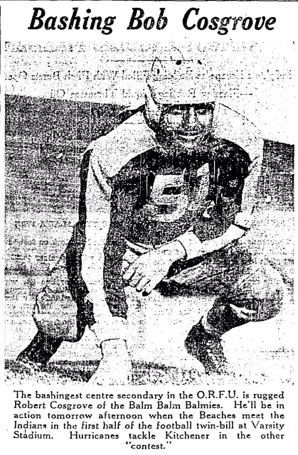 Bob Cosgrove (1915-1981) played for various Toronto-based football teams in the 1940s, including the Toronto Balmy Beach Beachers (called the Balm Balm Balmies in this photo).