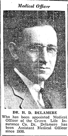 As usual, out of curiosity, I looked Dr. Delamere up in the Toronto city directories. It turns out that Harold D. Delamere had found his niche in life when he was appointed Crown Life's medical officer: he held the position for 25 years, as he was listed in this role in the 1960 directory. The 1961 and 1962 directories show him as at Crown Life, but no longer as medical officer; after that, he retired.