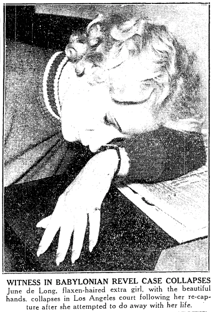 A Google search turned up this page, which tells the story of a morals trial featuring Ms. DeLong, movie extra Gloria Marsh, and Dave Allen, who was the head of Central Casting, the principal agency for casting extras in movies. I also found this photograph of her.