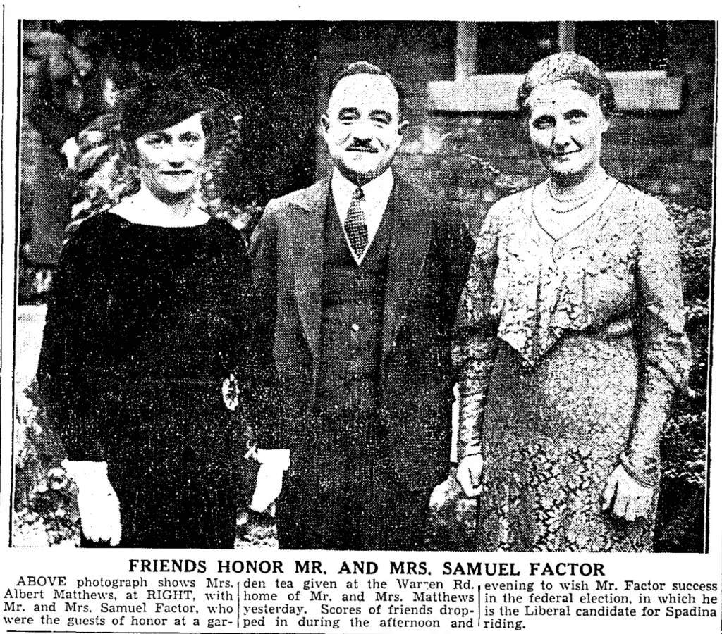 Samuel Factor (1892-1962) became the Liberal Member of Parliament for Toronto West Centre in 1930, becoming the first Jewish Member of Parliament from Ontario. He was the only Liberal elected in Toronto that year. Factor went on to win in the newly-created Spadina riding in 1935 and was re-elected in 1940. In the latter election, he once again became the only Toronto Liberal.