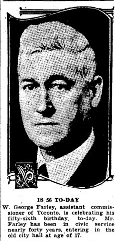 I looked up W. George Farley in the Toronto city directories. He was easy to find: the 1929 directory had a bold-face entry for him. He was listed as the chief assessor of the Assessment Department at City Hall, with his address as 144 Macpherson Avenue.