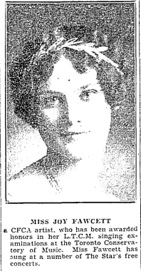 Joy Fawcett (sometimes appearing as Joyce Fawcett) is listed as a music teacher in the 1928 Toronto city directory. By 1936, she was teaching at the Toronto Conservatory of Music, where she originally studied. She is not listed in the 1937 directory; my best guess is that she got married.