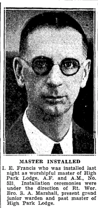 Out of curiosity, I traced I. E. Francis in the Toronto city directories. He was almost certainly Isaac E. Francis, who worked at Elias Rogers (the coal people) in a variety of jobs from 1933 to 1957. He last appears in the 1957 directory - I couldn't find him, or a mention of a widow, in 1958.