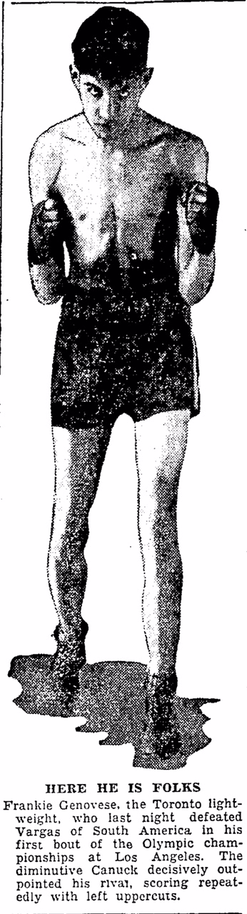 Frankie Genovese (1915-1998) was just 16 when he competed for Canada at the Olympics. After winning his first match, he lost his second match to Mario Bianchini of Italy.