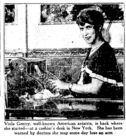 Viola Gentry (1894-1988) set a non-refueling endurance record for a woman pilot when she remained in the air continuously for eight hours, six minutes, and 37 seconds on December 20, 1928. In July 1929, she attempted to regain the record, which had risen to 13 hours; she crashed her plane, which killed her co-pilot and caused her to suffer a fractured skull and crushed shoulders. It took her more than six months to recover.