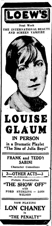 Louise Glaum (1888-1970) appeared in over 110 movies between 1912 and 1925. After this, she returned to the stage, where she started. She toured the Loew's Theatre chain with The Sins of Julia Boyd and with The Web, which she wrote herself.