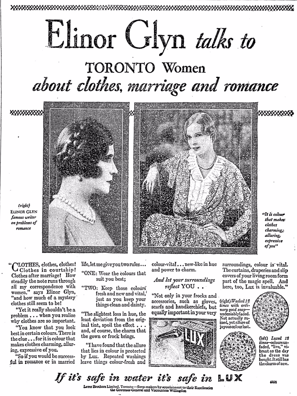 In the 1920s, Ms. Glyn became a Hollywood screenwriter; she gave Clara Bow the title of "the It girl", which helped make her a star. At about the time this ad appeared, she had exhausted her finances and she had returned to writing novels; the fee that she obtained for endorsing Lux probably helped her out. Ms. Glyn had two daughters, both of whom married baronets.