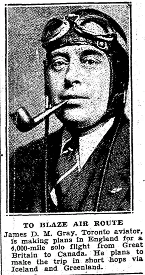 Since he is described as a Toronto aviator, I looked him up in the Toronto city directories. The 1932 directory lists J. D. M. Gray as the proprietor of The Aviation Shop; I'm pretty sure this is him. He has a common name, but I think I found him in some subsequent directories: