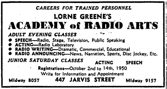 In the 1950 Toronto city directory, the Academy Of Radio Arts is listed with "Lorne Green" as its president. (His name at birth was Lyon Himan Green, which may or may not explain this.) The academy appears in the 1952 city directory but not the 1953 directory; this might be when Mr. Greene left Canada in search of fame and fortune in the U.S.