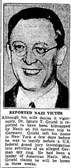 Ignatz Theodor Griebl (1899-unknown) was a doctor, specializing in obstetrics, who immigrated to the United States from Germany in 1925. He was also the head of the German spy network in the U.S., and he fled to Germany in May 1938 on the S.S. Bremen to escape prosecution. He reportedly became a physician in Vienna.