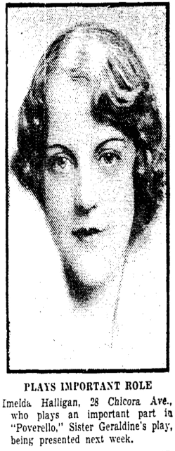 She first appears in the 1929 directory as "Meldah Halligan". There's also a John C. Halligan at 28 Chicora Avenue; I assume that this was her father. The city directory had trouble with Ms. Halligan's first name: between 1929 and 1932, she was referred to as Meldah, Imelda, and Amelda.