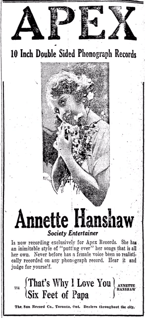 Annette Hanshaw (1901-1985) had sold over four million records by 1934, the year in which Radio Stars magazine voted her the best female popular singer. According to a biography on a Jazz Age music site, she was a shy, introverted person who never toured or performed on stage. Her music career ended in 1937 when she retired to become a housewife.