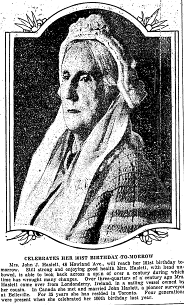 As usual, I wanted to indulge my morbid curiosity: how much longer did Mrs. Haslett stay alive? I did a search of the Toronto city directories, and found Frances C. Haslett listed in the 1929 directory as the widow of John J. and living at 48 Howland. It looks like she got to celebrate at least one more birthday and possibly two: she appears in the 1930 and 1931 directories, but not in 1932.