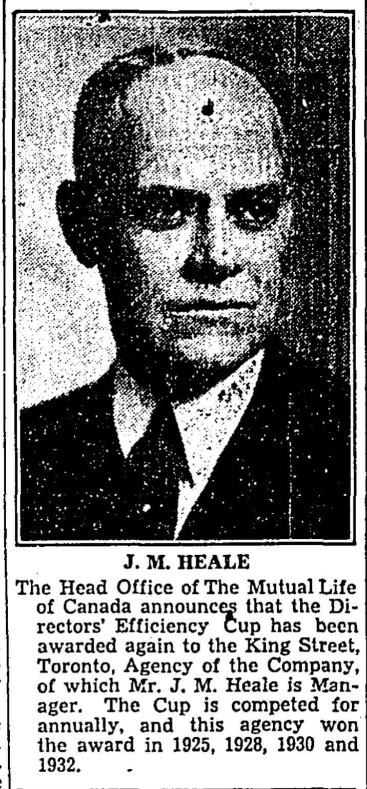Out of curiosity, I looked up J.M. Heale in the Toronto city directories, and he turned out to be easy to find: Joseph M. Heale had a bold-face entry in every city directory that I looked at between 1918 and 1946. By 1925, when the agency won its first Cup, he was the manager, and he remained there through 1946. In 1947, he was just listed under his home address and not in bold-face, which suggests that he retired that year.
