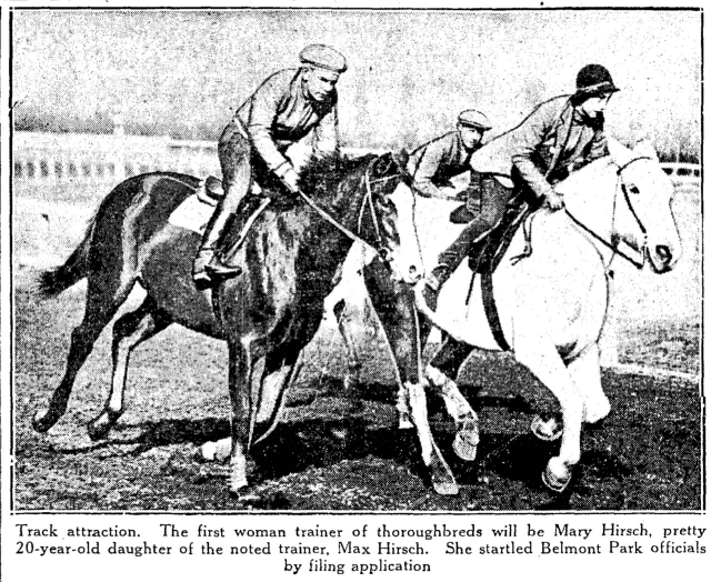 A search turned up this article on Mary Hirsch. Apparently, her 1933 application was "tabled", but she persisted, and she was licensed to train in Illinois and Michigan in 1934. By 1936, she was licensed to train almost everywhere, and she trained an entry in the 1937 Kentucky Derby, becoming the first woman to do so. Her training career ended in 1940 when she married racing official Charles McLennan.
