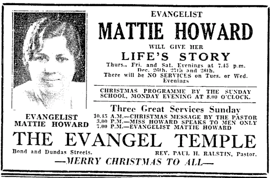 Many evangelists led a less than exemplary life before finding God, but Mattie Howard was an extreme example of this. Born in 1894, Ms. Howard was convicted in 1919 of second-degree murder. At the time, she was dubbed "The Bandit Queen of Kansas City". During her murder trial, she met Irish president Eamon de Valera.
