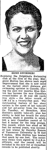At the 1934 Commenwealth Games, Margaret Hutton won gold medals as part of the 4x110 freestyle and 3x110 medley relay teams. A photograph of her from 1949 is in the City of Edmonton archives. The caption states that she is a champion swimmer from California; perhaps she had moved there by the time of the photo. She was elected to the Ontario Aquatic Hall of Fame in 1999.