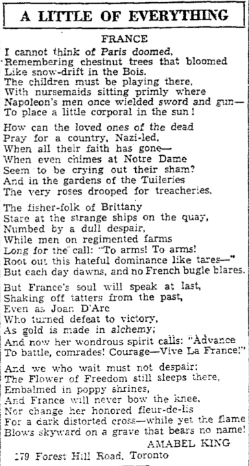 This poem provided the writer's name and address, which gave me the opportunity to trace her in the Toronto city directories. The 1942 city directory lists Charles W. King at 179 Forest Hill Road; he was a sales manager for Willard's Chocolates. But it also lists Amabel King as a major in the Salvation Army Rescue Home and living at 450 Pape Avenue, which is the address of the rescue home (also referred to as the Girls' Industrial Home). Amabel is an unusual name, so perhaps Ms. King was devoted enough to her cause to live at least part of the time at the home. Or perhaps this was someone else; I have no way of knowing.