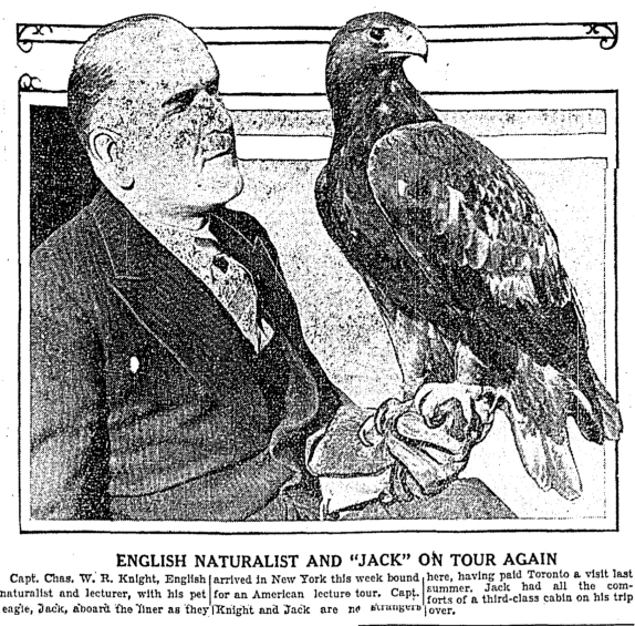 C. W. R. Knight (1884-1957) earned his rank of Captain by serving as a sniper in the First World War. With a later star pupil eagle, Mr. Ramshaw, he appeared on the Fred Allen radio show in 1940; the eagle flew about the studio, throwing the show into "hysterical chaos".