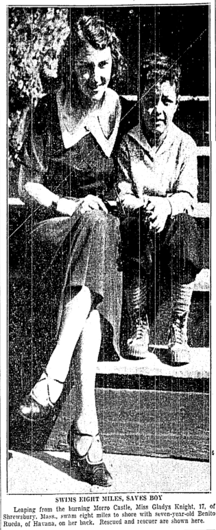 Ms. Knight's accomplishment, described in the caption above, was impressive, to say the least: it would have been hard enough to swim eight miles to shore even without a seven-year-old boy on your back. Searching for information on her on the Internet turned up nothing, which is not surprising given that she had the same name as a famous singer. The swimmer and the singer were 27 years apart in age; it's possible, but unlikely, that one went to see the other perform.