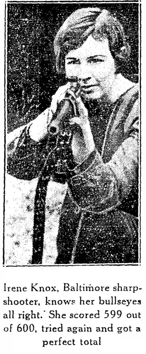 I didn't find much on Irene Knox, but I did learn that she was inducted into the University of Maryland Athletics Hall of Fame in 1992. She was the National Rifle Champion in 1932 with a perfect score and placed second in 1933 by one point. She was also third in 1931.