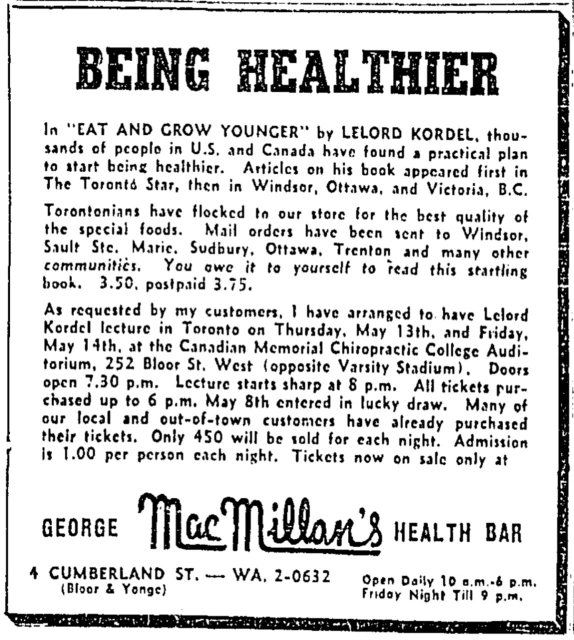 Lelord Kordel (1904-2001) was a self-proclaimed nutritionalist who tended to stretch the boundaries of truth a bit when describing his products: in 1971, after a long appeal, he was fined $10,000 and served one year in prison for fradulent health claims. One review of his book, Health Through Nutrition, claimed that it was "made up of such a weird concoction of science, pseudo-science, and dietary fads that it will be most difficult for the average reader to sift the authentic information from the unauthenticated claims, and to remain unaffected by the latter".