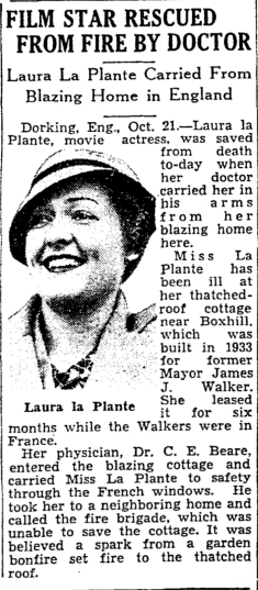 Laura La Plante (1904-1996) lived for over 60 years after being carried to safety by her doctor. Her career peaked in the silent film era; between 1933 and 1935, she appeared in British films produced by Warner Brothers' Teddington Studios, known for producing "quota quickie" films.