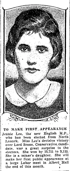 Jennie Lee (1904-1988) won her seat in a by-election in 1929 and then retained it in a general election the same year. At the time that she was elected, women under the age of 30 were not allowed to vote in Britain.